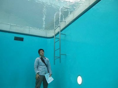 Sebenarnya pada bagian yg bawah kolam renang, ada pintu masuk di sebelahnya buat kesitu .. lalu atapnya itu dari kaca, trus diatas kacanya, diisi air sedikit sehingga seolah-olah yang dibagian atas melihat yang dibagian bawah seperti sedang di dalam kolam renang...untuk lebih jelasny mari simak gambar-gambar kolam renang yang unik tersebut...